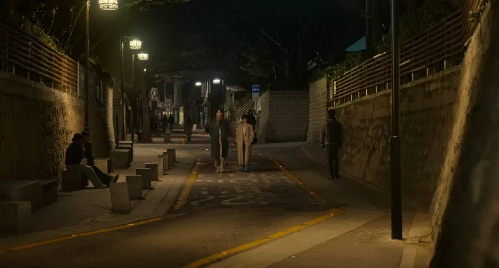 二人が並んで歩き、チュ・ホジンがマフラーを解いてあげた場所
